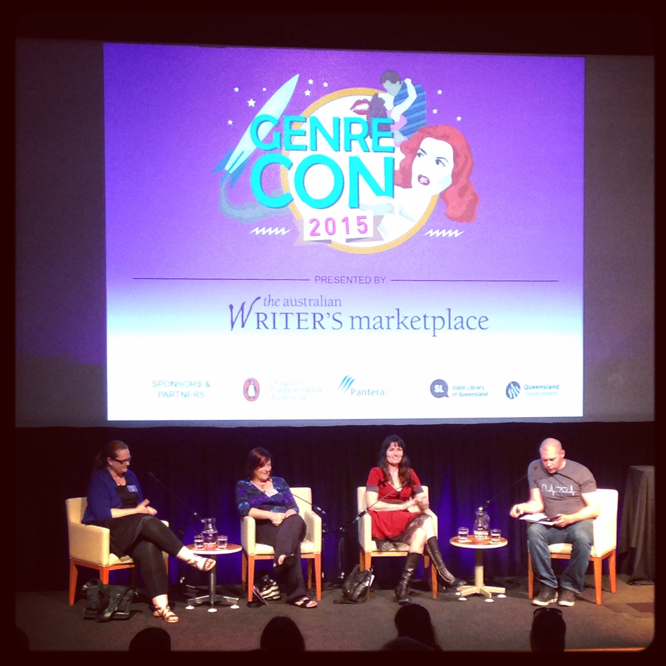 I volunteered to chair a panel this year, and I’m so glad I did. I was fortunate enough to be on stage with three extremely warm, wise and intelligent panelists. Kim Wilkins I knew from previous Genrecons (Genres-con?), but I hadn’t met Keri Arthur until I sat down beside her at lunch one day and after some minutes chatting she mentioned that she would be on a panel, and I mentioned that I would be chairing one. ‘Which one?’ she asked, from which we discovered that it would be the same one. Angela Slatter (now ‘World Fantasy Award Winner’ to go along with the many other well-deserved honourifics in her bio) I didn’t meet until we were onstage together and the crowd was filing in. The nerves were short-lived though, and the panel soon became an open and easily moderated conversation, from which I learnt a great deal.